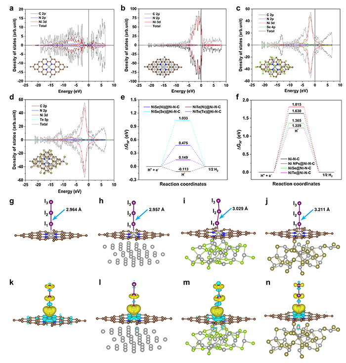 图4.(a)Ni-N-C,(b)Ni NPs@Ni-N-C,(c)NiSe@Ni-N-C和(d)NiTe@Ni-N-C的结构弛豫和相应态密度的俯视图。(e)NiSe@Ni-N-C中NiSe位点处(Ni-H*;Se-H*)和NiSe@Ni-N-C中NiTe位点处(Ni-H*;Te-H*)H吸附的吉布斯自由能图。(f)Ni-N-C,NiNPs@Ni-N-C,NiSe@Ni-N-C和NiTe@Ni-N-C外层(Ni-N-C)上Ni位点处的H吸附的吉布斯自由能图。(g)Ni-N-C,(h)Ni NPs@Ni-N-C,(i)NiSe@Ni-N-C和(j)NiTe@Ni-N-C上I吸附的侧视图。(k)Ni-N-C,(l)Ni NPs@Ni-N-C,(m)NiSe@Ni-N-C,和(n)NiTe@Ni-N-C的差分电荷密度图(黄色代表电子积累,亮蓝色代表电子耗尽)。