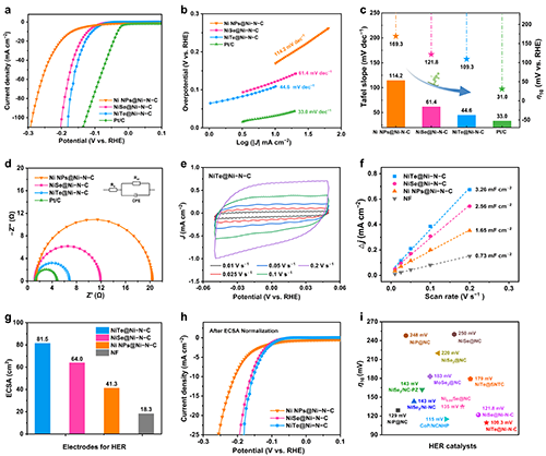 图3. 碳基催化剂和基准Pt/C的(a)LSV极化曲线,(b)Tafel斜率,(c)过电位(η10)和Tafel斜率的比较以及(d)Nyquist图。(e)NiTe@Ni-N-C在不同扫描速率下的CV曲线。碳基催化剂和泡沫镍的(f)电化学双层电容,(g)电化学活性面积以及(h)经ESCA归一化后的LSV极化曲线。(i)NiTe@Ni-N-C与已报道的碳基非贵金属催化剂HER性能的比较。