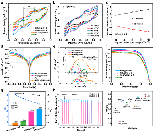 图4.(a)碳基催化剂和Pt的CV曲线。(b)NiTe@Ni-N-C在不同扫描速率下的CV曲线以及相应的(c)Ip与扫描速度平方根之间的关系。碳基催化剂和Pt的(d)Tafel曲线,(e)EIS图,(f)J–V曲线以及(g)电化学参数(Rct和ΔEp)与PCE之间的关系;(h)NiTe@Ni-N-C与NiSe@Ni-N-C的(h)光响应测试。(i)NiTe@Ni-N-C与已报道的碳基对电极在太阳电池中的PCE比较。