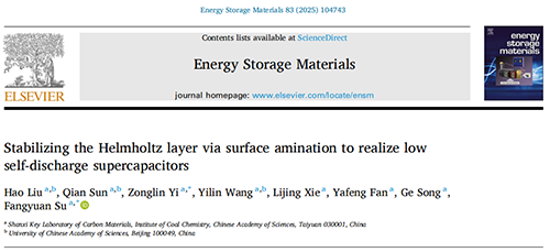 近日,中国科学院山西煤炭化学研究所苏方远研究员团队在超级电容器自放电机制与界面调控方面取得重要进展。研究成果以“Stabilizing the Helmholtz Layer via Surface Amination to Realize Low Self‐Discharge Supercapacitors”为题发表于《Energy Storage Materials》期刊。本工作首次明确了双电层超级电容器未充电状态下PC基电解液中阴离子在负极表面的自发吸附是其快速自放电的微观起源,并采用多孔炭表面氨基化策略抑制阴离子特异性吸附,实现了超级电容器静置500小时电压保留率大于71%的自放电性能,相较于行业内静置72小时电压保留率不低于80%的要求有了极大改善,为提升实际工况下超级电容器电化学性能提供了新见解。