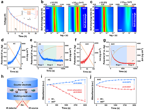 为明确界面电解质离子吸脱附行为,本工作建立了跨尺度、跨时间窗口的多维电化学原位表征体系。离子在电极表面的静态吸附行为解析通过KPFM、Zeta电位、PZC、DFT计算和分子动力学模拟等手段。自放电过程中的动态扩散行为通过EQCM、in-situ ATR-FTIR和in-situ EIS组合提供定量精确解析。上述结果表明,自放电过程中的电极表面的阴离子自发吸附被显著抑制,阳离子吸附主导的Helmholze层的稳定性被明显提高,为之前的设计链条提供了强有力的证据。
