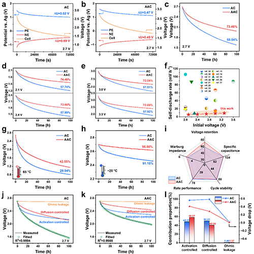 超级电容器(EDLC)作为一种高功率密度、长循环寿命的储能器件,在可再生能源的快速存储与管理领域具有重要应用价值。然而其固有的自放电现象导致的电压损失仍是制约实际应用的核心瓶颈。现有研究表明,由扩散控制的非法拉第过程引发的自放电是EDLC自放电的主导因素。但电极-电解液界面阴、阳离子吸附行为差异对自放电性能的影响仍缺乏深入研究,特别是阴离子在电极表面的自发吸附是否驱动负极快速自放电,长期以来缺乏直接证据。