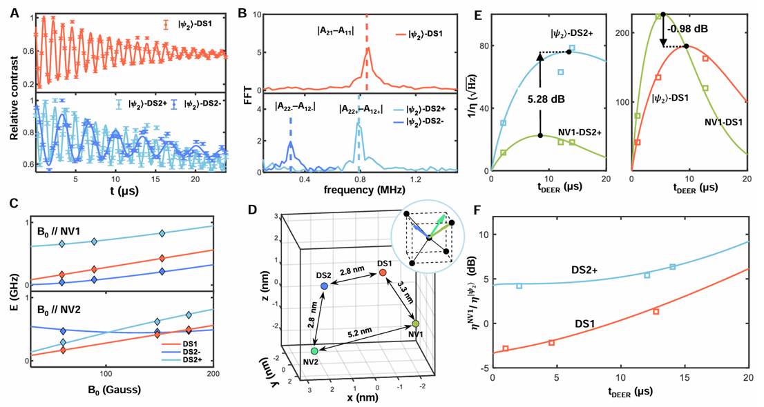 图2展示了实验实现纠缠传感的关键要素与初步光谱结果。图中包含了实验中使用的纳米柱阵列与NV对结构示意图、用于制备和探测纠缠态的脉冲序列,以及利用纠缠态进行DEER光谱扫描所获得的清晰共振峰。该图证实了基于纠缠态的传感方案已成功制备,并能够有效探测到位于钻石中的单个电子暗自旋。