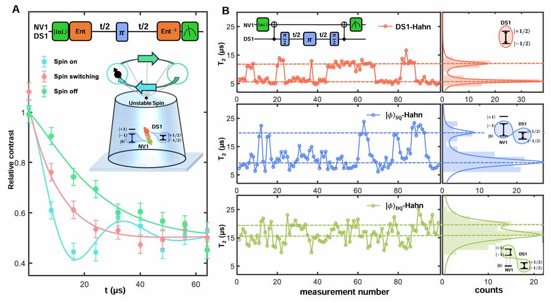 图4将纠缠传感的应用拓展至不稳定的亚稳态自旋。该图通过监测与一个界面亚稳态自旋耦合时传感器相干性的演化,直接捕捉到了该自旋在“开启”和“关闭”状态之间随机切换的动态过程。研究还表明,通过设计另一种双量子纠缠态,可以有效抵抗这种动态噪声,将传感相干时间延长,展现了该方案在处理复杂自旋体系,即静态与动态自旋并存场景下的强大能力。