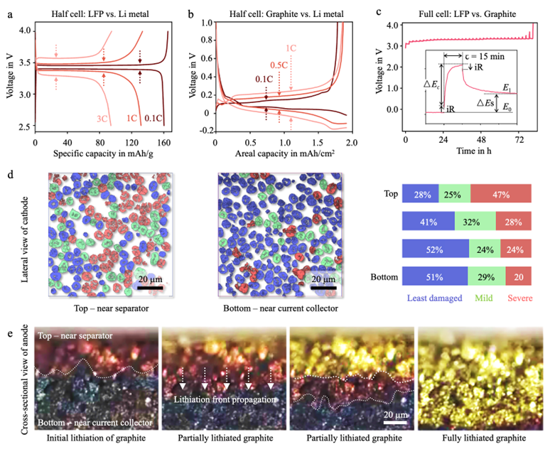 Electrochemical polarization in battery electrodes and cells. a) Half-cell (LFP vs. Li metal) cycling data at various C-rates. b) Half-cell (graphite vs. Li metal) cycling data at various C-rates. c) Full-cell (LFP vs. graphite) GITT data, with an inset illustrating the voltage evolution during a titration step. d) Depth-dependent cathode damage profile revealed by X-ray nano-tomography, inferring the polarization in NMC cathode electrode. e) Depth-dependent anode SOC evolution revealed by operando optical microscopy, inferring the polarization in graphite anode electrode.