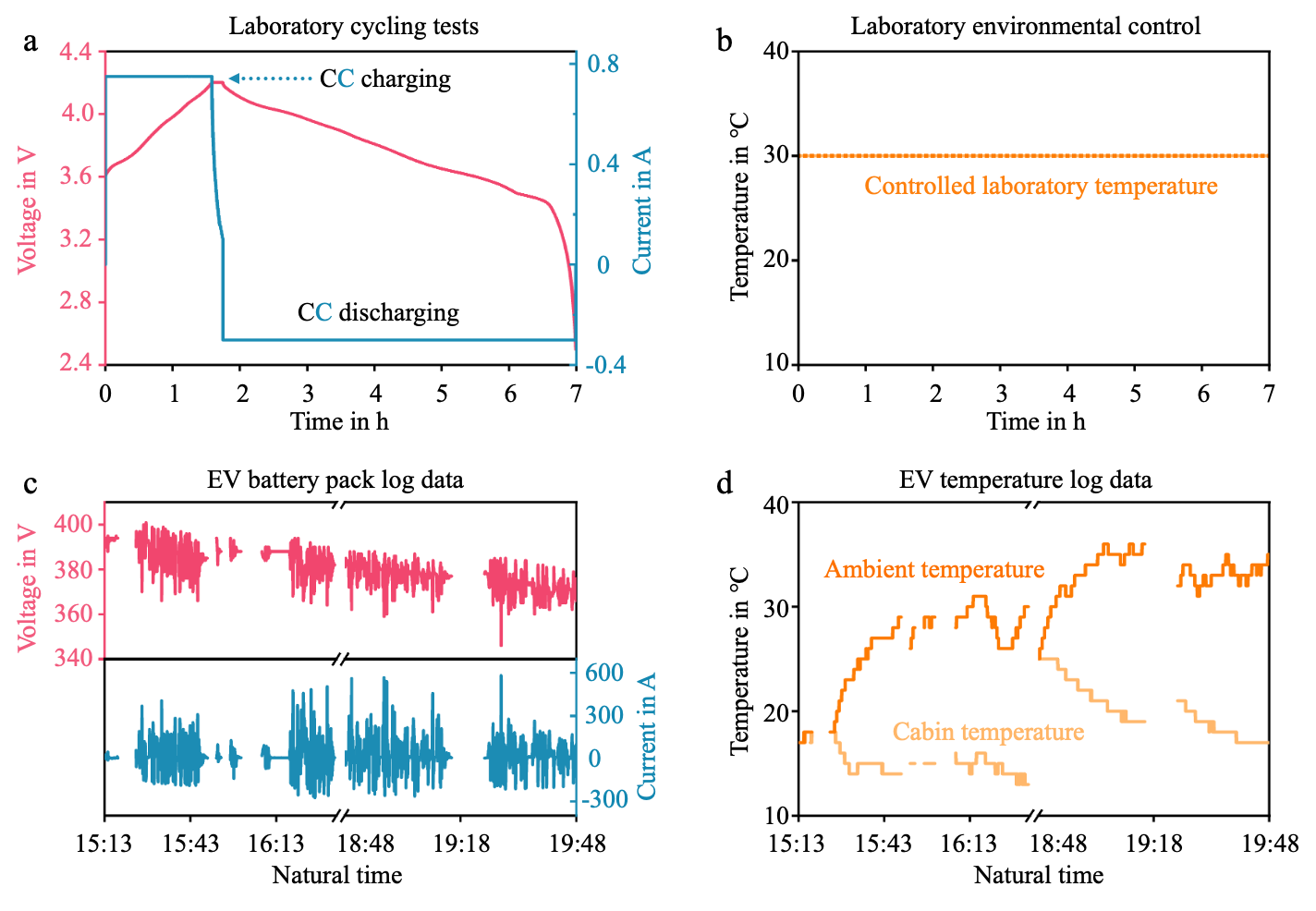 Laboratory controlled battery duty cycle and the duty cycles in electric vehicle in real-world service. a) A standard CC-CV charging and CC discharging duty cycle for a newly purchased commercial 18650-type NMC–graphite lithium-ion cell (nominal capacity 1.5 Ah, nominal voltage 3.6 V, unused). b) The corresponding temperature duty cycle under controlled laboratory environment. c) The voltage and current log data of an EV in real-world service. d) The corresponding temperature log data from this EV.