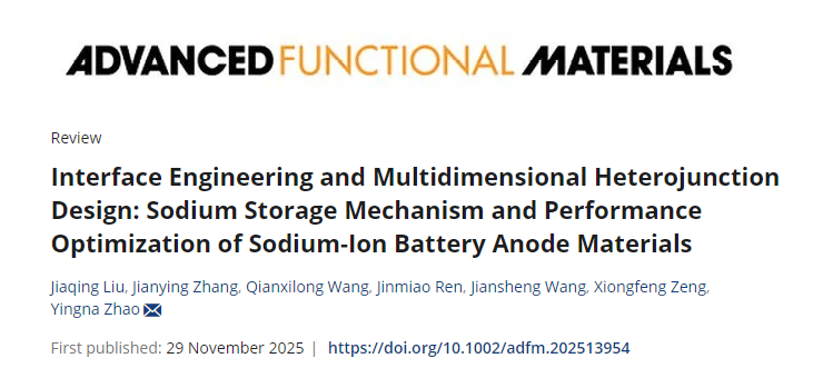 Jiaqing Liu , Jianying Zhang, Qianxilong Wang, Jinmiao Ren, Jiansheng Wang, Xiongfeng Zeng ,Yingna Zhao*,Interface engineering and multidimensional heterojunction design: sodium storage mechanism and performance optimization of sodium-ion battery anode materials,Advanced Functional Materials(2025)