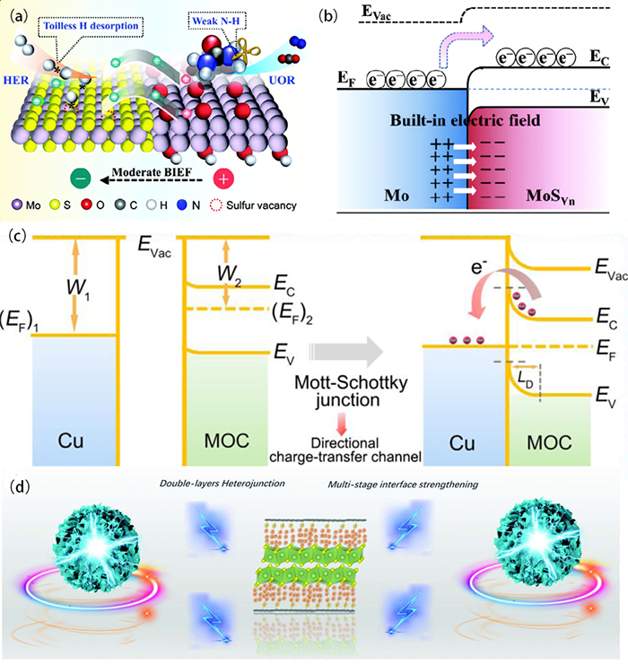 异质结材料近年来在能源存储与转换领域引起了广泛关注。通过复合的方法构建的异质结对电池的性能有显著的提升,界面工程是提升电池性能的关键,同时内建电场是界面工程中最显著的特征之一。通过合理设计异质结界面(如碳基、MXene基等复合体系),可有效调控电子、空穴的传输行为。由于异质结两侧材料的费米能级不同,电子会从高费米能级侧向低侧迁移。这种电荷重新分布形成了内建电场,显著加速了离子传输动力学。高导电性碳基材料与高容量过渡金属硫硒化物复合,可同步优化电子传导网络与钠离子扩散路径。这种界面工程不仅有效缓解了充放电过程中的体积应变效应,还通过内建电场加速电荷转移,显著提升电化学反应动力学。