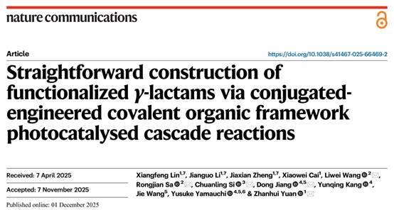 近日,福建农林大学材料工程学院袁占辉教授团队在Nature子刊《Nature Communications》(中科院一区TOP,影响因子:15.7)在线发表了题为“Straightforward Construction of Functionalized γ-Lactams via Conjugated-engineered Covalent Organic Framework Photocatalysed Cascade Reactions”的研究论文。福建农林大学为论文第一完成与通讯单位,材料工程学院林祥丰副教授和郑加贤博士为共同第一作者,闽江学院、天津科技大学及澳大利亚生物工程与纳米技术研究所参与了本研究工作。