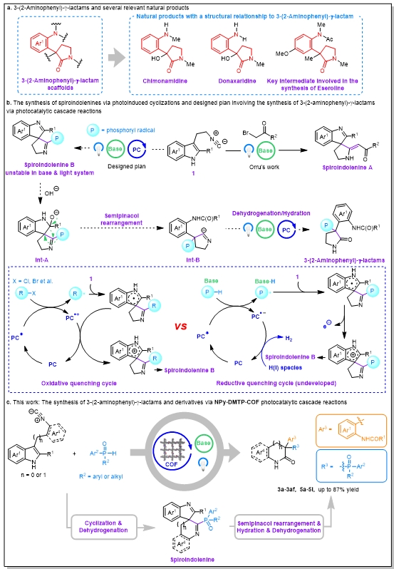 官能化γ-内酰胺广泛存在于多种生物活性分子中,开发其直接构建路径具有重要价值,然而产物稳定性差与非对映选择性难以控制等问题,使得该类合成方法仍具挑战。本研究将可见光驱动的多相催化与可再生生物质原料相结合,提出了一种绿色、可持续的官能化γ-丁内酰胺构建新策略。研究团队设计并构建了一种萘基-芘-共价有机框架材料,可在室温条件下高效催化生物质衍生色胺异腈与氧化膦的串联反应,高产率合成一系列3-(2-氨基苯基)-γ-丁内酰胺类化合物。该光催化反应在生物质催化转化领域和多相光催化领域有重要的应用前景。