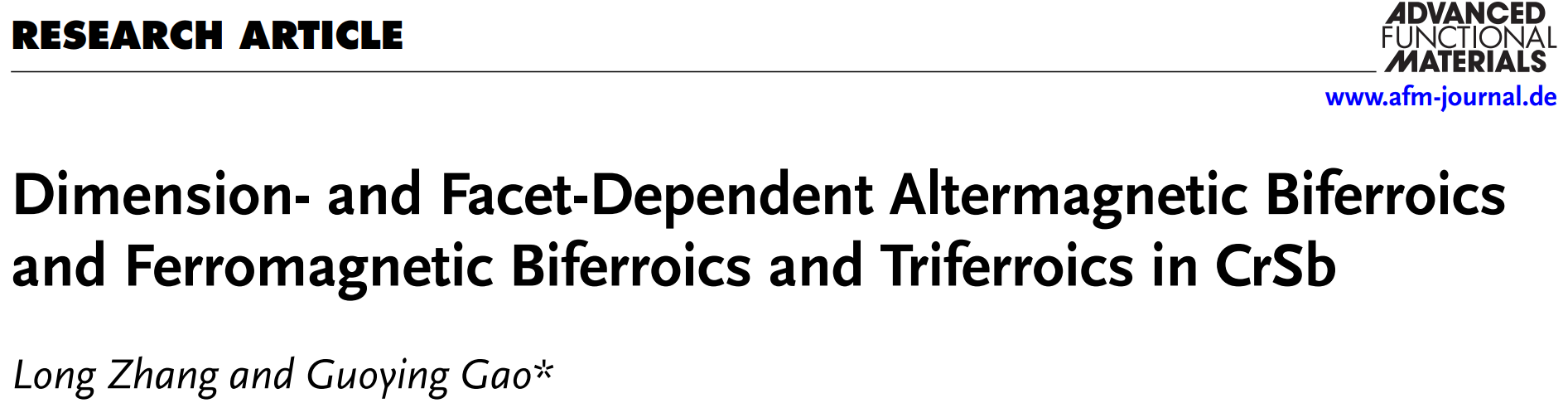 Long Zhang and Guoying Gao.* Dimension- and Facet-Dependent Altermagnetic Biferroics and Ferromagnetic Biferroics and Triferroics in CrSb. Adv. Funct. Mater., 2025, e25978. https://doi.org/10.1002/adfm.202525978