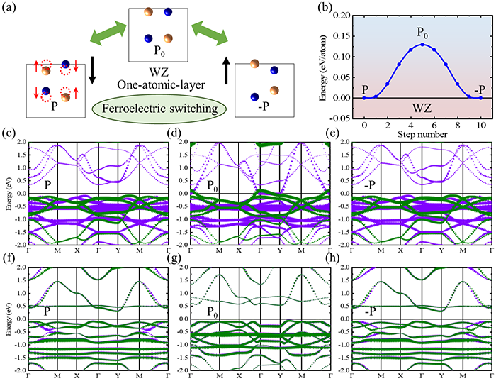 图1:WZ相单层CrSb(110)面的(a)铁电翻转和(b)势垒,(c-e)铁磁和(f-h)反铁磁构型下自旋分辨Cr贡献的能带。