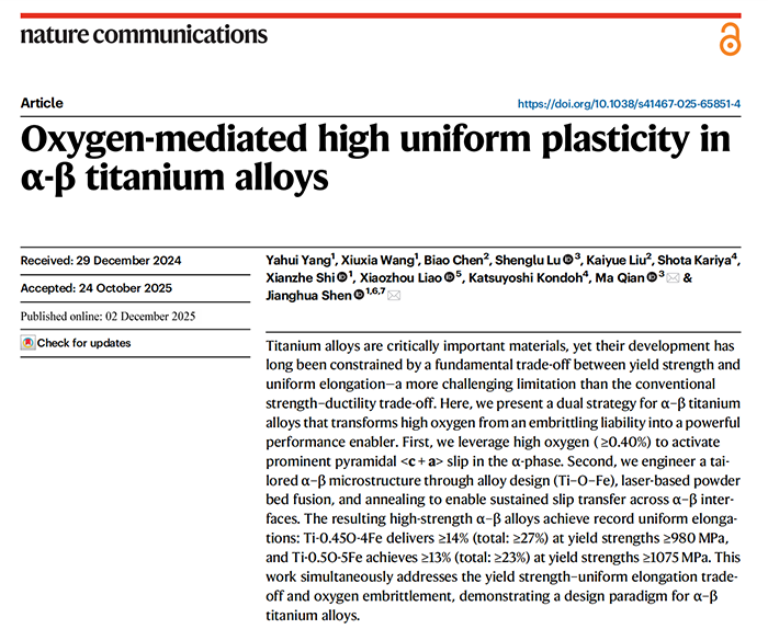 近日,西北工业大学航空学院沈将华教授团队与澳大利亚皇家墨尔本理工大学马前教授团队深度合作,在《Nature Communications》上发表题为《Oxygen-mediated high uniform plasticity in α-β titanium alloys》的研究论文,提出了一种创新的“高氧+铁”钛合金设计策略。该策略成功突破了钛合金中长期存在的强度与均匀塑性难以兼得的瓶颈,在实现低材料成本高性能钛合金制备的同时,将传统上被视为钛合金脆性元凶的高氧元素,转化为可同步大幅提升材料强度与塑性的关键组元。沈将华教授和马前教授为该论文的共同通讯作者,第一作者为西北工业大学航空学院博士生杨亚辉。