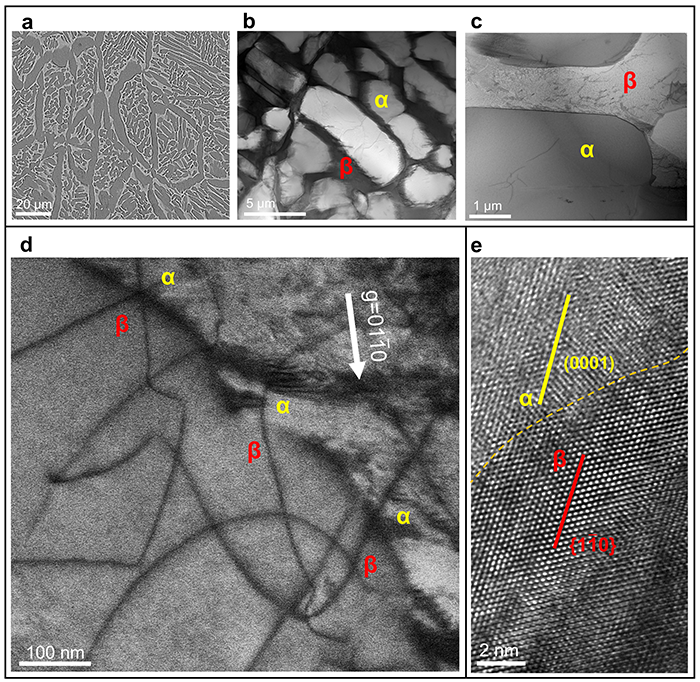 构建α-β片层结构促进滑移传递:通过添加廉价β稳定元素铁(Fe),并结合激光粉末床打印技术与后续热处理,构建出具有连贯界面的α-β层片结构,实现滑移跨相界持续传递,进一步提升均匀塑性。