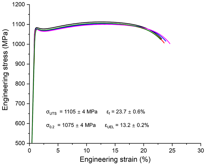 图7. Ti-0.5O-5Fe合金(PBF-LB + 800 °C退火1小时)的工程应力-应变曲线。