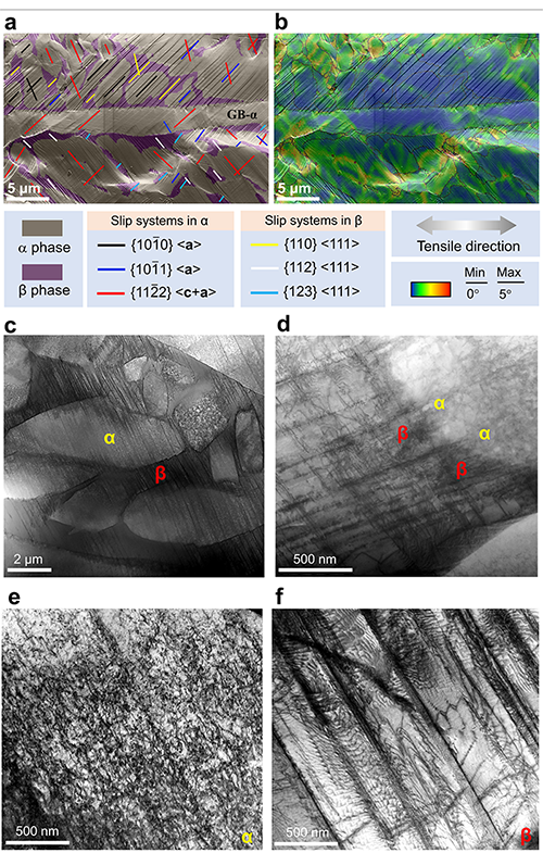 图5. α-β Ti-0.45O-4Fe合金(PBF-LB + 800 °C退火1小时)在拉伸变形过程中的位错活动。