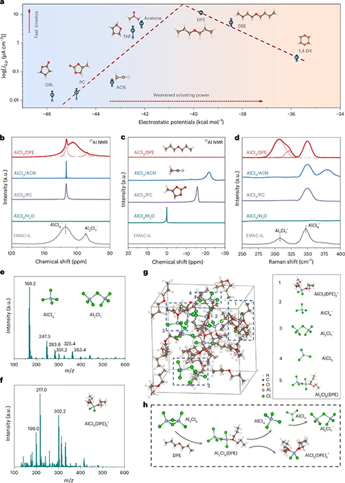 作者通过有机溶剂分子静电势分析与铝沉积动力学测试,筛选出正丙醚(DPE)作为最优溶剂,其在“火山图”中位于动力学性能顶点(图1a),表明溶剂的适度溶剂化能力对于铝的沉积动力学至关重要。通过核磁、拉曼、质谱、理论计算与分子动力学模拟,证实AlCl3/DPE电解液中的阴离子主要为AlCl4−,而阳离子则为“有机双氯”溶剂化结构的AlCl2(DPE)2+,区别于传统离子液体和其他有机电解液。尽管所有有机电解液中均含有AlCl4−阴离子,但是不同电解液体系中的阳离子物种却不尽相同。作者发现“有机双氯”AlCl2(DPE)2+溶剂化物种的形成与有机溶剂的溶剂化能力直接相关,在较强溶剂化能力的有机溶剂中(如碳酸丙烯酯(PC)、乙腈(ACN)),电解液中的阳离子以Al(solvent)63+的形式存在,而弱溶剂化能力的有机溶剂对AlCl3盐的解离能力又不足,导致较低的溶解度,只有当有机溶剂的溶剂化能力适中时,Cl−才会与有机溶剂共同进入Al3+的溶剂化鞘层,形成“有机双氯”溶剂化结构的阳离子物种,从而实现较快的铝沉积动力学。