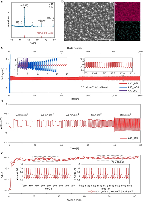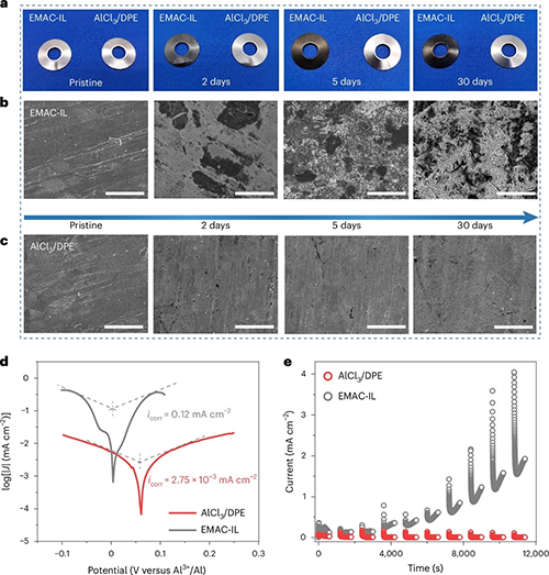 日前,天津大学Nanoyang团队在《Nature Sustainability》发表重要研究成果,该研究提出了一种全新的“有机双氯”电解液设计策略,以氯化铝/正丙醚(AlCl3/DPE)有机体系替代传统离子液体,有效解决了铝金属电池长期面临的腐蚀性难题,为实现实用化铝金属电池迈出重要一步。通过对有机溶剂溶剂化能力的精确筛选与调控,构建了独特的“有机双氯”溶剂化结构(AlCl2(DPE)2+),不仅显著降低了电解液的腐蚀性,还保持了优异的铝沉积/溶解可逆性。实验表明,该电解液对不锈钢、铜等多种金属集流体表现出极低的腐蚀速率,同时实现铝金属负极超过2000小时的稳定循环和高达99.85%的铝沉积/溶解库伦效率。基于该电解液的铝金属电池展现出优异的循环稳定性,可稳定运行300次以上。这一突破性进展为铝金属电池的实用化铺平了道路,也为其他多价金属电池电解液设计提供了全新思路。该研究成果以“Non-corrosive organodichloro electrolyte for reversible aluminium metal batteries”为题于12月4日发表在Nature Sustainability(DOI: 10.1038/s41893-025-01706-6)上。