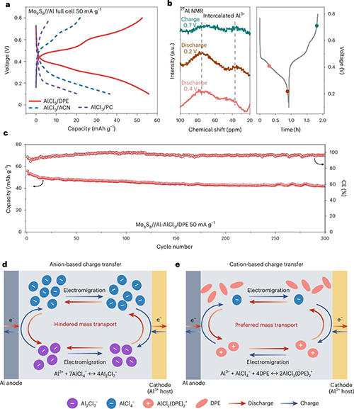 最后,作者采用Mo6S8正极与Al负极匹配组装了全电池原型器件,以探究AlCl3/DPE电解液与正极的兼容性和在全电池中的适用性。得益于其独特的易脱溶AlCl2(DPE)2+阳离子,采用AlCl3/DPE电解液Mo6S8//Al全电池显示出最高的比容量和最小的电压之后(图5a)。27Al谱固体核磁证实了Al3+在Mo6S8中的可逆嵌入/脱出(图5b),并实现稳定循环,300次循环后容量保持率约为75%(图5c),表明该电解液与Al负极和正极均具有出色的兼容性。