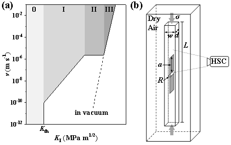 图1、(a)硅酸盐玻璃典型的裂纹扩展速度-应力强度因子(v–KI)曲线;(b)DCDC实验装置示意图