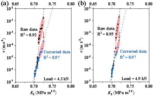 相比之下,压缩双裂纹圆孔板法(DCDC)通过在干燥惰性气氛下获取区域III的裂纹扩展速度-应力强度因子(v–KI)曲线,并采用反应动力学指数模型求解KIc(图1),具备清晰的物理内涵。Wiederhorn基于阿伦尼乌斯反应动力学方程推导出:硅酸盐玻璃在区域III中遵循指数关系v = A exp(B·KI);且通过大量实验总结出硅酸盐玻璃KIc对应的裂纹扩展速率约为10–1 m/s。因此,只要能够准确获得区域III的本征v–KI曲线,即可通过指数拟合得到准确的KIc数值。然而,实际DCDC测试中存在下述异常现象(图2):高速相机帧间隔变化时,在v–KI曲线上观测到了明显的不同程度的斜率改变现象。这一异常直接削弱了指数模型的拟合效果,从而影响KIc的准确性和可重复性。