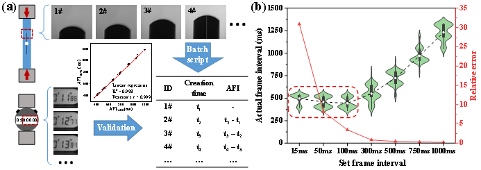 图3、(a)双重验证的帧间隔提取与校正方法;(b)实际帧间隔与设定帧间隔(AFI-SFI)的非线性关系(红色实线:相对误差;黑色实线:AFI平均值)