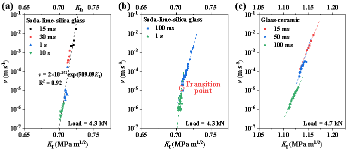 图2、(a)DCDC方法测得的钠钙硅酸盐玻璃v–KI曲线(虚线:v = A exp(B·KI)方程拟合线)与断裂韧性(KIc);(b,c)DCDC测试中的异常现象:斜率转折(b)与曲线分段(c)