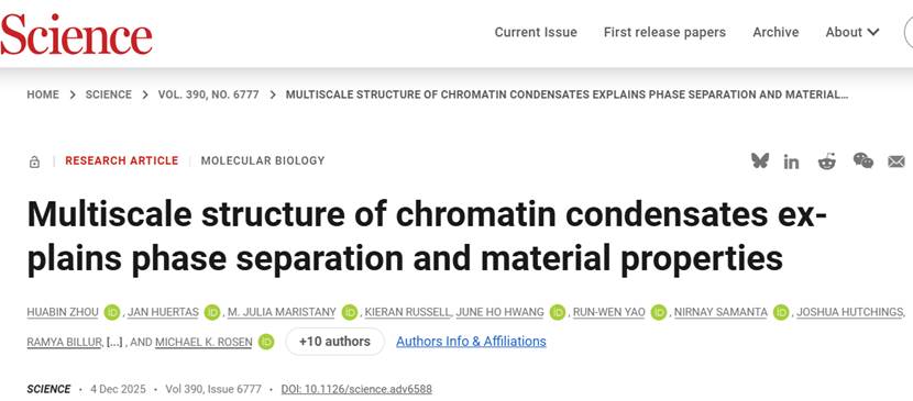 原文详情:Huabin Zhou et al., Multiscale structure of chromatin condensates explains phase separation and material properties. Science390, eadv6588(2025). DOI:10.1126/science.adv6588