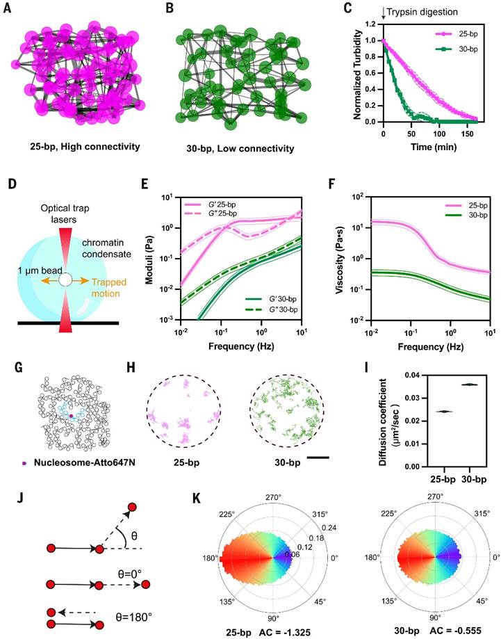 图5 从网络连通性与动态特性角度25 bp与30 bp染色质凝聚体的材料性质比较© 2025 AAAS