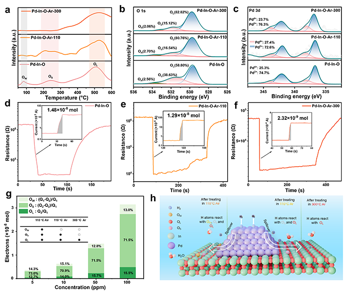 图3. (a)分别在110°C和300°C下处理Ar前后的Pd-In-O纳米片的O2-TPD曲线(b)O 1s XPS光谱和(c)Pd 3d XPS光谱。Pd-In-O在110°C下分别为(d)Pd-In-O、(e)Pd-In-O-Ar-110和(f)Pd-In-O-Ar-300对50 ppm H2的响应-恢复曲线。插图是计算出的电子转移数。(g)计算出的电子转移数和基于Pd-In-O的传感器氢感测中各种氧对不同浓度H2的贡献,插图是温度差下热处理后Pd-In-O上的氧物种分布。(h)Pd-In-O纳米片上H2传感机制的示意图。