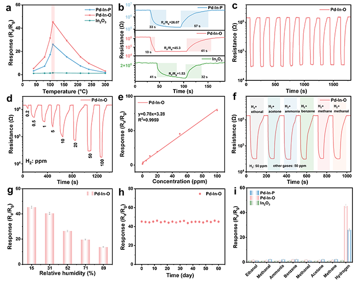 图2.(a)基于In2O3、Pd-In-O和Pd-In-P的传感器在不同工作温度下对50 ppm H2的响应。(b)In2O3、Pd-In-O和Pd-In-P在110°C时对50 ppm H2的响应-恢复曲线。(c)Pd-In-O传感器在110°C下对50 ppm H2的动态循环性能。(d)动态响应-恢复曲线和(e)Pd-In-O传感器与0.2–100 ppm H2的线性相关。(f)Pd-In-O传感器的干扰选择性,测试气体包括H2+乙醇、H2+丙酮、H2+氨、H2+苯、H2+甲烷、H2+甲醛。(g)Pd-In-O传感器在不同相对湿度下对50 ppm H2的传感响应。(h)Pd-In-O传感器在110°C下60天的传感稳定性。(i)在110°C下,In2O3、Pd-In-O和Pd-In-P对H2、乙醇、甲烷、氨、苯、甲醇、丙酮、甲烷的感应选择性。 带有误差线的数据点表示独立测量的平均值±标准差(n = 3)。