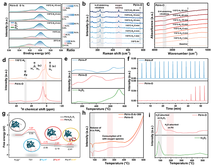 图4. (a)Pd-In-O的准原位XPS分析。(b)Pd-In-O暴露于H2 20 min时的原位H2-拉曼光谱。(c)Pd-In-O暴露于H2 30 min时的原位H2-DRIFTS光谱。(d)H2处理后Pd-In-O和Pd-In-O的1H ssNMR光谱。(e)In2O3、Pd-In-O和Pd-In-P的H2-TPD曲线。(f)Pd-In-O和Pd-In-P的H2脉冲吸附光谱。(g)Pd-Ov-In2O3和Pd-In2O3模型上H2解离和迁移的自由能图。蓝色、红色和深黄色球分别代表 Pd、O 和 In 原子。(h)Pd-In-O和Pd-In-O-Ar-300的H2-TPR曲线。(i)In2O3和Pd-In-O的H2O-TPD图谱。
