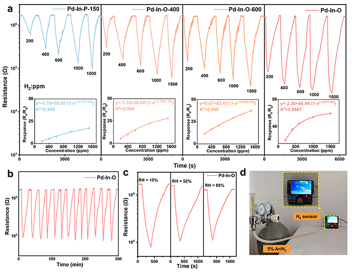 图5.(a)室温(25°C)下200-1500 ppm H2的Pd-In-P-150、Pd-In-O-400、Pd-In-O-600和Pd-In-O传感器的动态响应-恢复曲线,插图显示了相应的非线性拟合曲线。(b)Pd-In-O传感器在室温下对200 ppm H2的动态循环性能。(c)Pd-In-O传感器在不同相对湿度下对200 ppm H2的动态响应-恢复曲线。(d)实时检测H2泄漏。