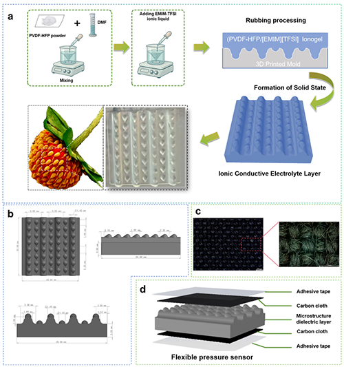 如图1所示,本研究构建了基于草莓表面分层结构的仿生离电压力传感器,展示了分层离子凝胶层的制备过程(图1a)、微结构的尺寸与几何构型(图1b)、导电碳布电极的光学显微图(图1c)及传感器分层组装截面(图1d)。通过3D打印复刻草莓果核形貌的模具制备离子凝胶介电层,并采用“导电碳布/离子凝胶/导电碳布”的夹层结构,电极尺寸略小于介电层以避免短路。这一受自然结构启发的分层设计,是实现传感器兼顾超宽量程与高灵敏度的关键基础。