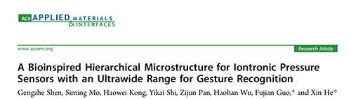 本工作受野生草莓表面多级结构的启发,设计并开发了一款仿生离子电子压力传感器。通过将刚性核果状突起与柔性山脊状结构整合,构建了分阶段连续变形机制,有效突破了柔性压力传感器在灵敏度与检测范围之间的固有权衡瓶颈。该传感器实现了0-3.57 MPa的超宽检测范围,并在两个区间均保持高灵敏度:低压区(0-250 kPa)为445.2 kPa-1,高压区(250-3570 kPa)为188.4 kPa-1,且两段线性良好。经过在976.1 kPa压力下的6000次加载-卸载循环,依然表现出卓越的耐久性和快速响应速度。将该传感器集成到智能手套,并结合网络化识别系统,可对26种手语手势进行识别,准确率达到94%。这一仿生设计能够应对从细微触觉到剧烈机械冲击的广泛力学刺激,为智能可穿戴设备、软体机器人等领域提供技术支持。本工作发表在ACS Applied Materials & Interfaces,第一作者是广东海洋大学沈耿哲博士,通讯作者是广东海洋大学郭福建博士和五邑大学何鑫教授。