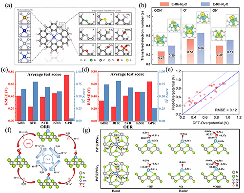 图9. (a) Sub@MN4结构示意图。(Sub@MN4中,Sub = B, N, O, S, CH3, NO2, NH2, OCH3, SO4;M = Fe, Co, Ni, Cu) (b) 基于Bader电荷分析,展示了从E-Rh-N4-C(红色)/E-Rh-N3-C(蓝色)向OOH*、O*和OH*转移的电荷值,并附有对应的电荷密度差图。 (c) 氧还原反应(ORR)与(d) 氧析出反应(OER)催化活性研究中,采用不同算法的机器学习模型测试集均方根误差(RMSE)与决定系数(R²)结果。(e) 机器学习预测的30个高活性结构均方根误差。(f) TM@PtSe₂体系中4e’氧电催化循环示意图。OER路径沿顺时针轨迹(蓝色)进行,而ORR则逆时针(红色)进行。(g) 原子尺度示意图,展示Pd×@PtSe₂与Pd●@PtSe₂体系中Pd-Se键长及Bader电荷分布。
