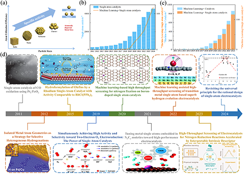 图1.(a)多尺度催化剂研究和相应活性关系的示意图。(b)关于“单原子催化剂”和“机器学习和单原子催化剂“这两个关键词(2011年至2024年的论文)。(c)关于“机器学习和催化剂”和“机器学习与单原子催化剂”的关键词(2011年至2024年)。(d)在SACs中应用ML的时间表。SACs的概念于2011年正式提出。到2012年,单原子合金催化剂首次应用。2015年,SACs取代了均相催化剂。ML从2019年开始应用于SAC。2020年,ML驱动的掺硼SACs高通量筛选用于固氮。2021年,ML协助设计了高性能电催化剂。2022年,ML协助过渡金属单原子的高通量筛选。到2023年,可解释的内在描述符加速了电催化剂的高通量筛选。2024年对支撑单原子电催化剂合理设计的普遍原理的重新审视。