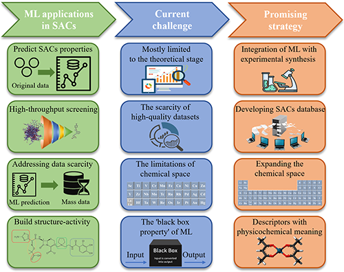 图10. 机器学习在SACs中的应用示意图、当前挑战及前景策略。