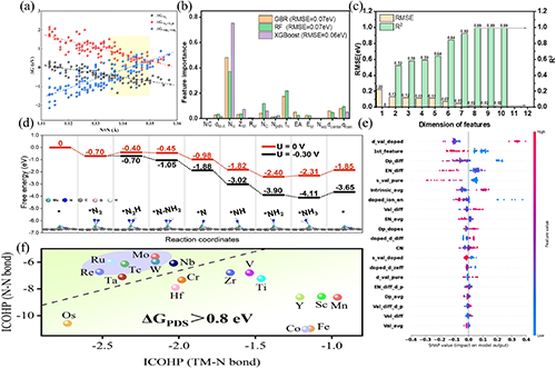 图8. (a) N≡N键距与关键NRR步骤中吉布斯自由能变化的相关性。(b) 特征重要性分析。(c) GBR方法下特征空间维度增加时均方根误差(RMSE)与决定系数(R²)的变化趋势。(d) Mo–B₂CN–(邻位B)分子零势能面及势能决定步骤的自由能图谱,含相关中间态。(e) ΔG*N2→*NNH预测的Shapley加性解释图。(f) 通过评估TM-N与N-N键的ICOHP值筛选高活性TM@C6N2纳米片的选择策略示意图。
