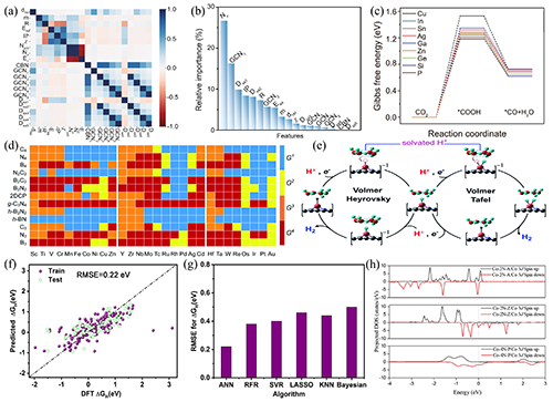 图7. (a) 基于皮尔逊相关系数分析得出的特征相关性热力图。(b) 基于平均影响因子评估的特征重要性排序。(c) 吉布斯自由能景观图展示了CO2还原为*CO的过程。(d) 根据TM嵌入技术对金属体凝聚能与电化学溶解电位进行分类的二维表面稳定性:G1:不可聚合且不可溶解;G2:可聚合且不可溶解;G3:不可聚合且可溶解;G4:可聚合且可溶解。(e) 不同二维表面上提出的电催化反应循环机制与路径。(f) 神经网络预测吉布斯自由能(ΔGH)的有效性。 (g) 不同算法预测ΔGH的均方根误差。 (h) Co-2N-A、Co-2N-Z及Co-4N-P模型中钴3d轨道态密度投影图。