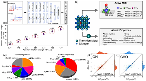 图6.(a)M@g-C3N4上CO2吸附能的ML辅助预测工作流程。(b)采用基于注意力的神经网络,通过红外和拉曼光谱分析对电场强度进行逆向预测。(c)XGBR采用27(左)和6(右)特征的特征重要性。(d)生成活性基序的表示以预测结合能。(e)和(f)使用m-DSTAR的ML预测结合能与通过DFT计算的结合能之间的比较图。