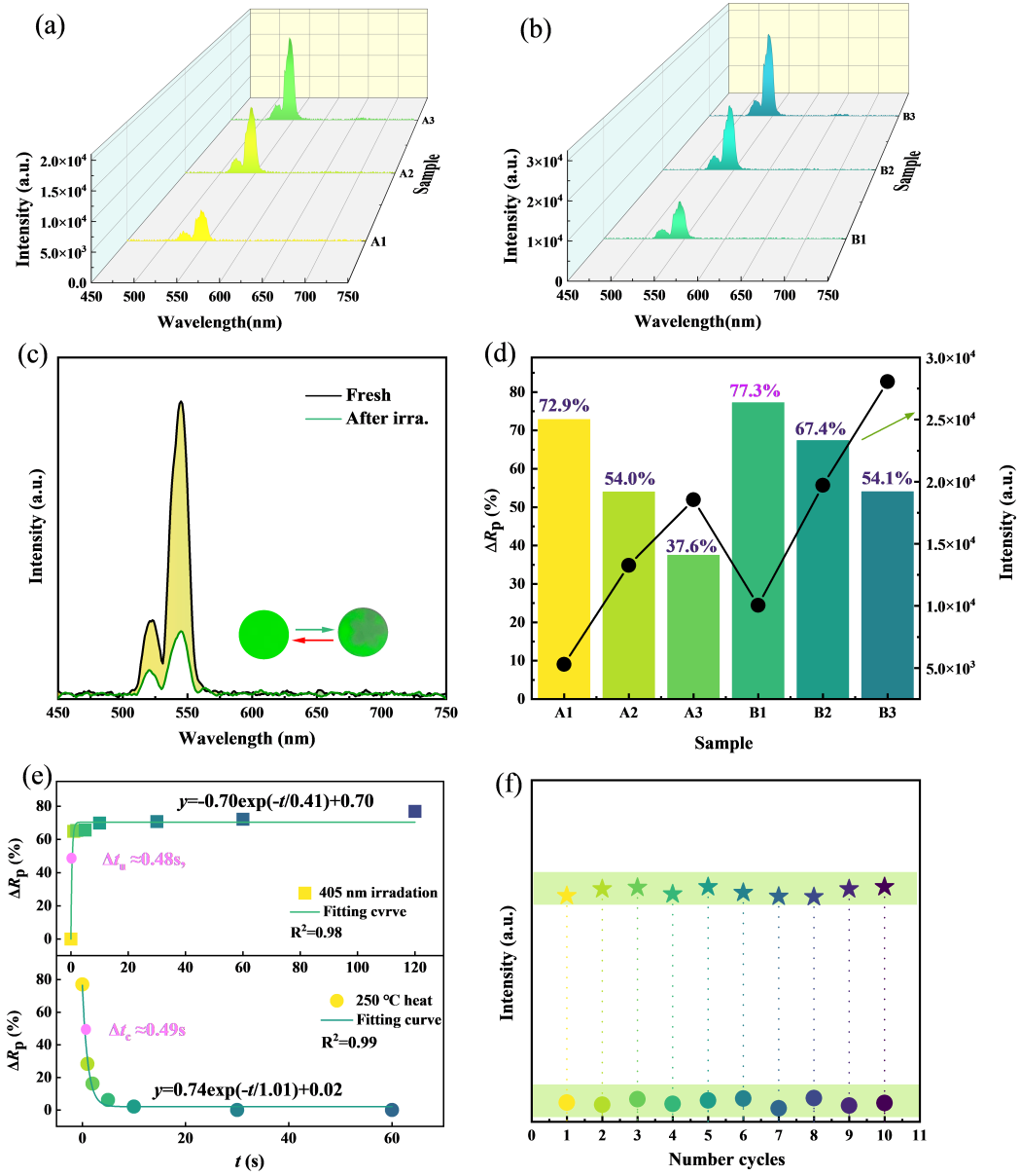 图3. (a) A1-A3样品在室温、980 nm波长激发下的上转换光谱。(b) B1-B3样品在室温、980 nm波长激发下的上转换光谱。(c) B1样品在405 nm光照2分钟前后的发光光谱。(d) A1-A3、B1-B3样品的ΔRp计算值与发光强度。(e) B1样品在600 nm处的ΔRp值随照射时间与漂白时间的变化。(f) B3样品的ΔRp值随循环次数的变化。