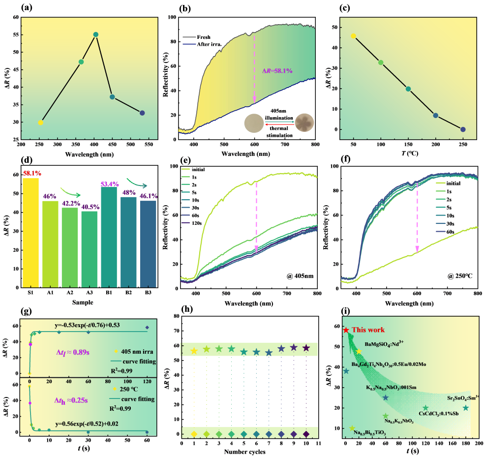 图2. (a) S1样品的ΔR值随照射波长的变化关系。 (b) S1样品的漫反射光谱。 (c) S1样品的ΔR值随漂白温度的变化关系。 (d) 所有样品的ΔR计算值。 (e) S1样品在不同照射时间下的漫反射光谱。 (f) S1样品在不同漂白时间下的漫反射光谱。 (g) S1样品在600 nm处的ΔR值随照射时间和加热时间的变化。 (h) S1样品的ΔR值随循环次数的变化。 (i) S1样品与其他光致变色材料的性能对比。