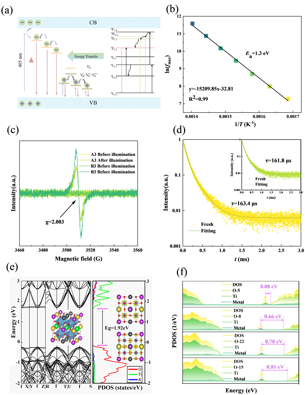 图4. (a) 光致变色机理示意图。 (b) ln fmax 与 1/T 的关系图。 (c) A3 和 B3 样品在 405 nm 光照前后的 EPR 谱。 (d) B3 样品在 405 nm 光照前后(插图中)的发光衰减曲线及拟合结果。 (e) 无缺陷高熵体系的能带结构及分波态密度(PDOS),插图为导带底(上)和价带顶(下)的电荷密度分布。 (f) 不同位置氧空位的高熵体系的分波态密度。