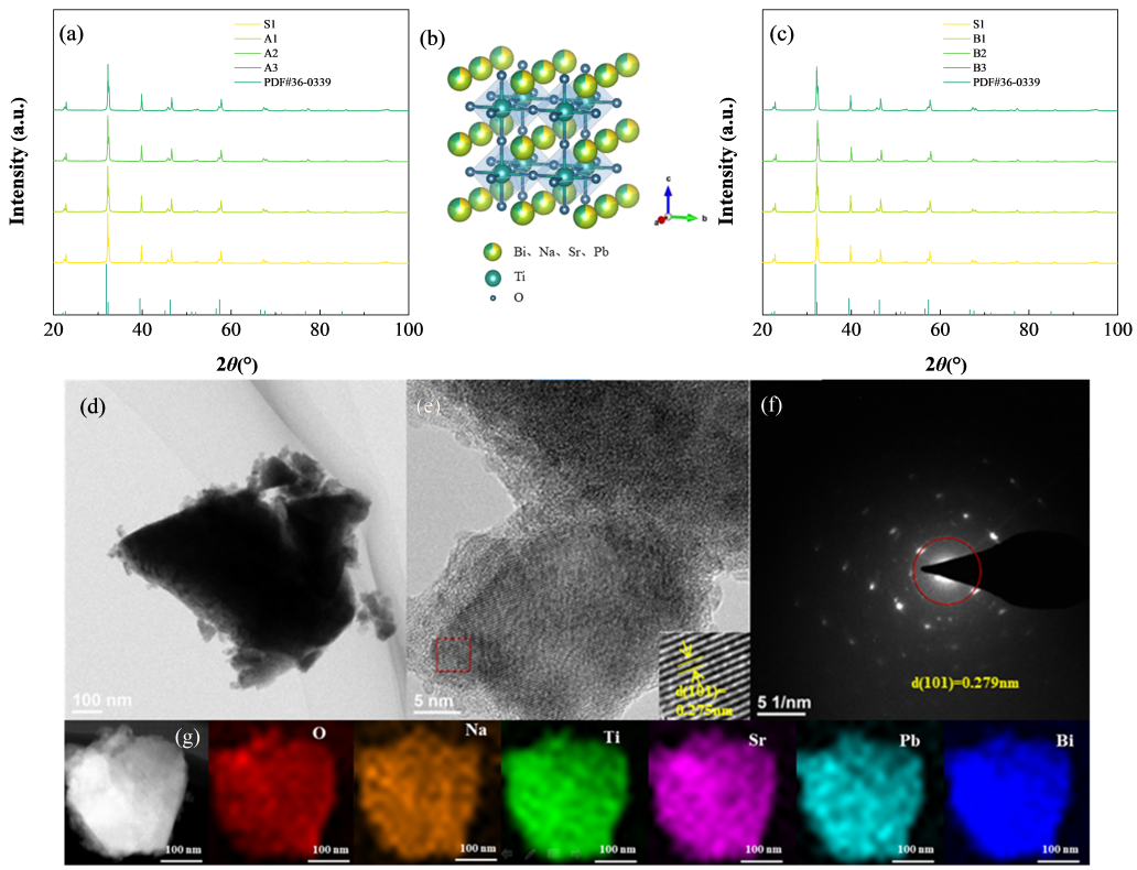 图1. (a) S1、A1-A3 样品的 XRD 图谱。 (b) HEP 基体的晶体结构。 (c) S1、B1-B3 样品的 XRD 图谱。 (d) S1 样品的 TEM 图像。 (e) S1 样品的 HR-TEM 晶格像。 (f) S1 样品的 SAED 图谱。 (g) S1 样品的 SEM 显微照片及对应的 O、Na、Ti、Sr、Pb 和 Bi 元素分布图。
