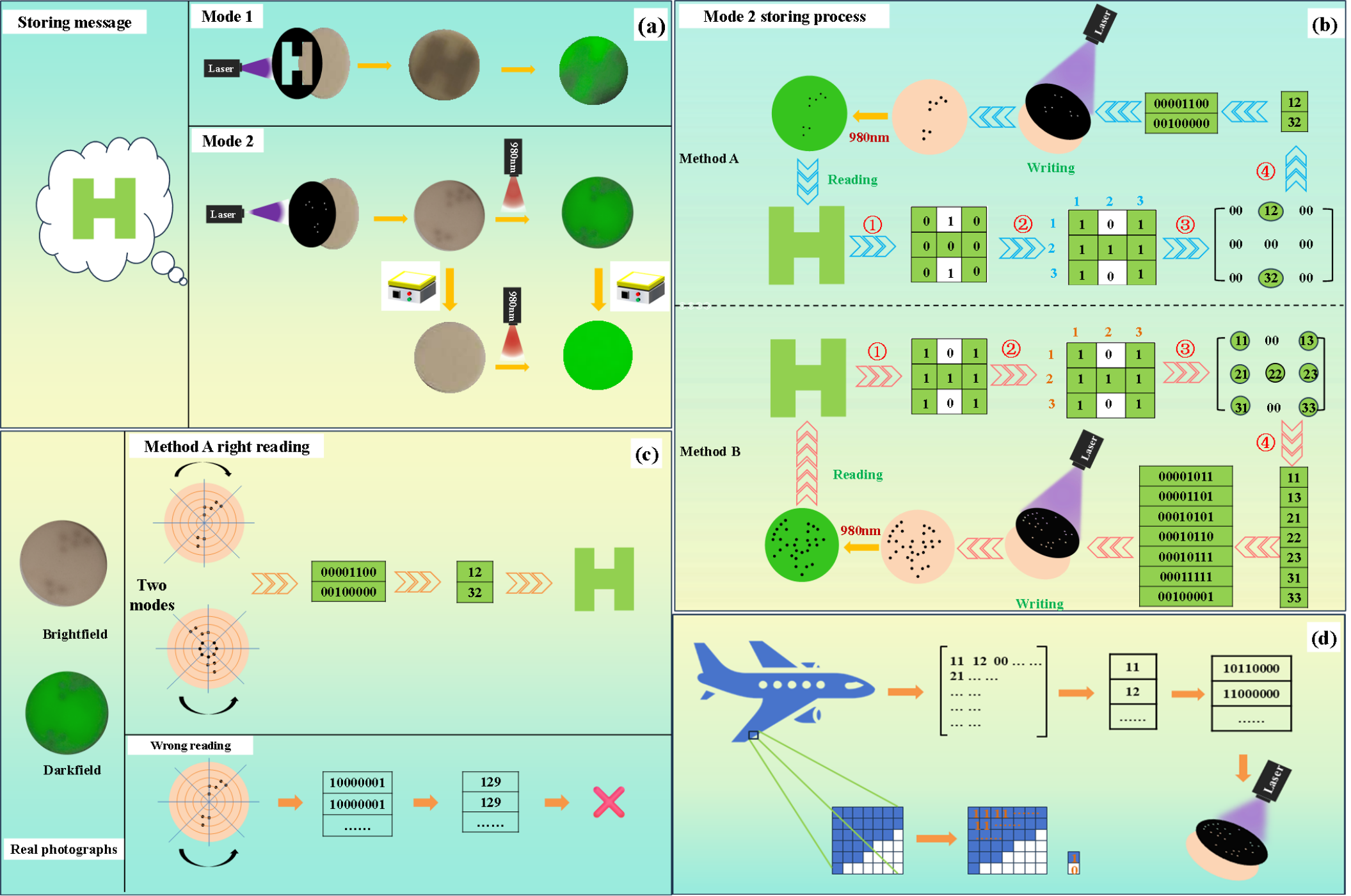 图5. (a) 两种图像存储模式的实物拍摄图。(b) 模式二的存储流程示意图。(c) 模式二中方法A的解密读取流程示意图。(d) 任意图像的存储示意图。