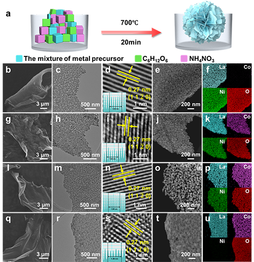 图3 二维多孔LaCoxNi1-xO3纳米片的形貌与结构表征:(a) 膨胀法合成示意图;(b-u)系列样品的 SEM、TEM、HRTEM、HAADF-STEM 图像及对应的元素分布