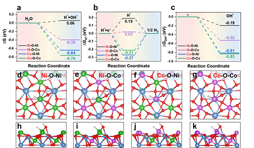 图2 四种桥位点的析氢反应吉布斯自由能及结构模型:(a) 水解离、(b) H*吸附及 (c) OH*吸附过程的自由能;(d-k) 水解离相关中间物构型的俯视图与侧视图