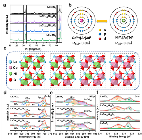 图4 LaCoxNi1-xO3样品的物性表征:(a) XRD 衍射谱图及30°-35°区域的放大图;(b-c) Co3+和Ni3+的电子结构及样品的晶体结构;(d-f)样品的Co 2p、Ni 2p及O 1s XPS图谱