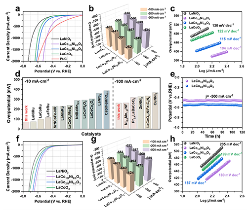 图5 LaCoxNi1-xO3样品的电催化析氢性能表征:(a-c) 1.0 M KOH 介质中的 LSV 极化曲线、不同电流密度下的过电位以及对应的 Tafel 斜率图;(d) -10 和 -100 mA cm-2 电流密度下的过电位对比;(e) 在 1.0 M KOH 中的稳定性测试;(f-h) 碱性模拟海水(1.0 M KOH + 0.5 M NaCl)体系中的 LSV 极化曲线、过电位分布及 Tafel 斜率。